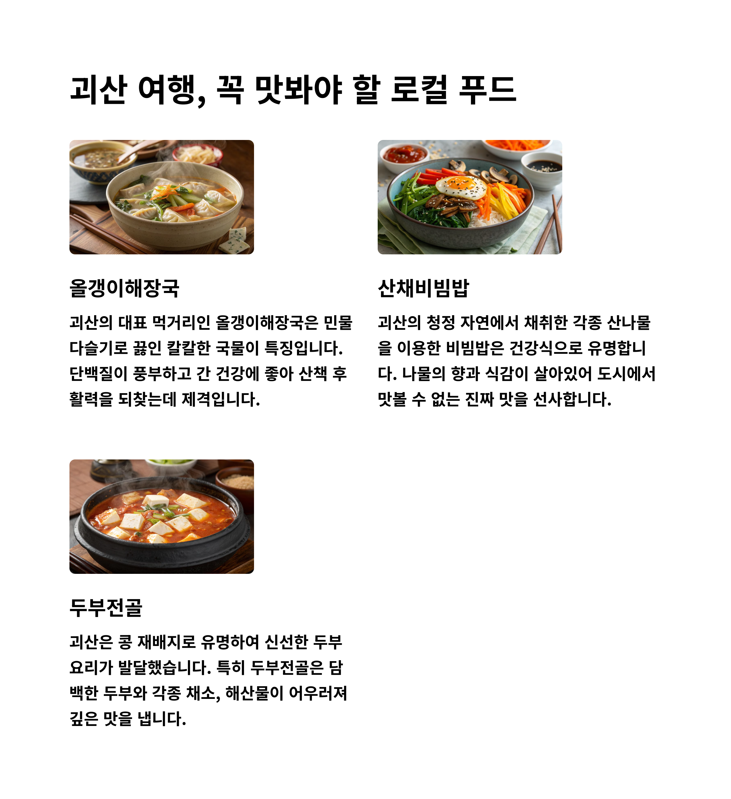 - 괴산 청국장: 발효의 깊은 맛을 느낄 수 있는 별미