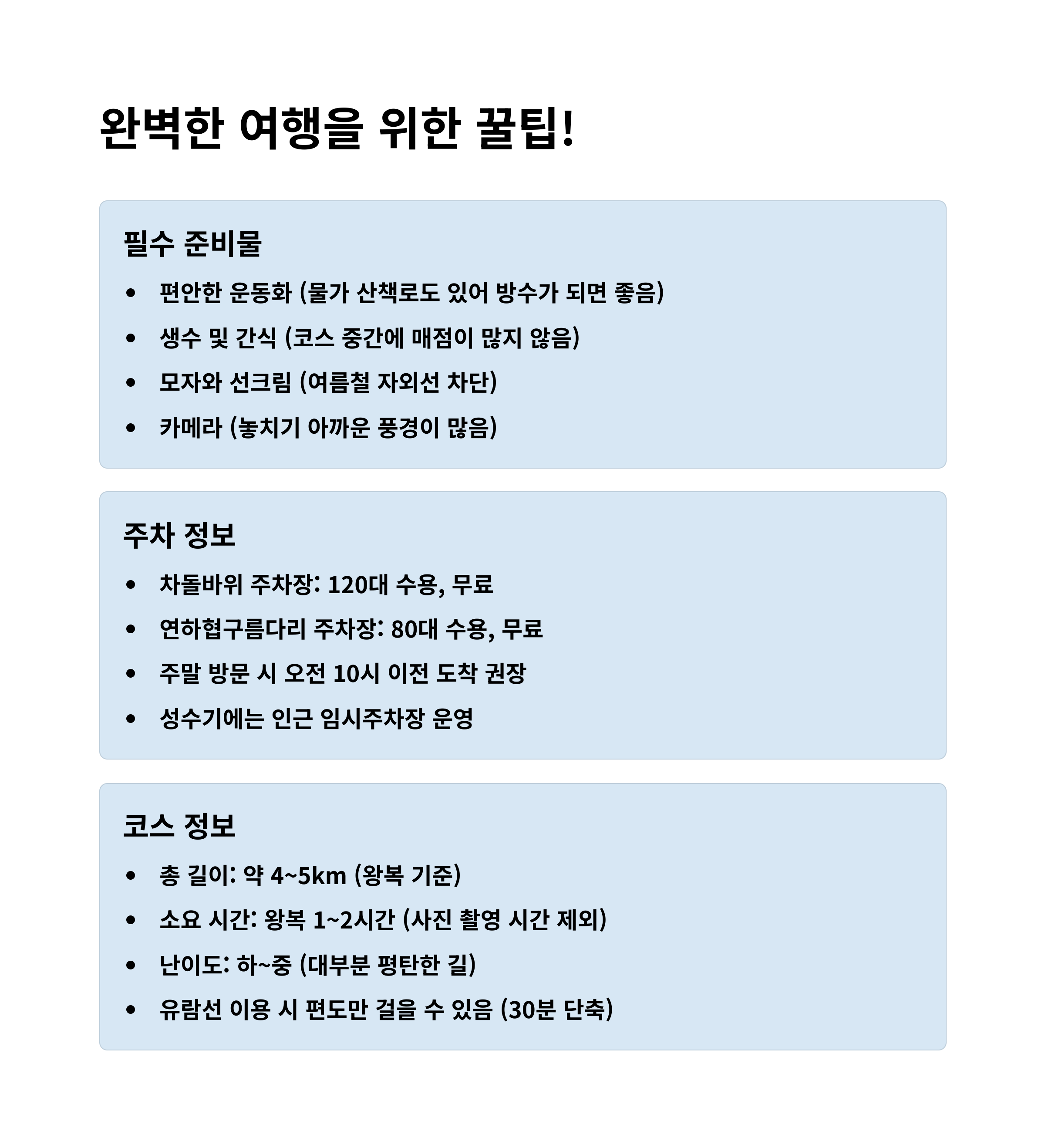 - 소요 시간: 왕복 약 2시간 내외, 여유롭게 걷기 좋아요