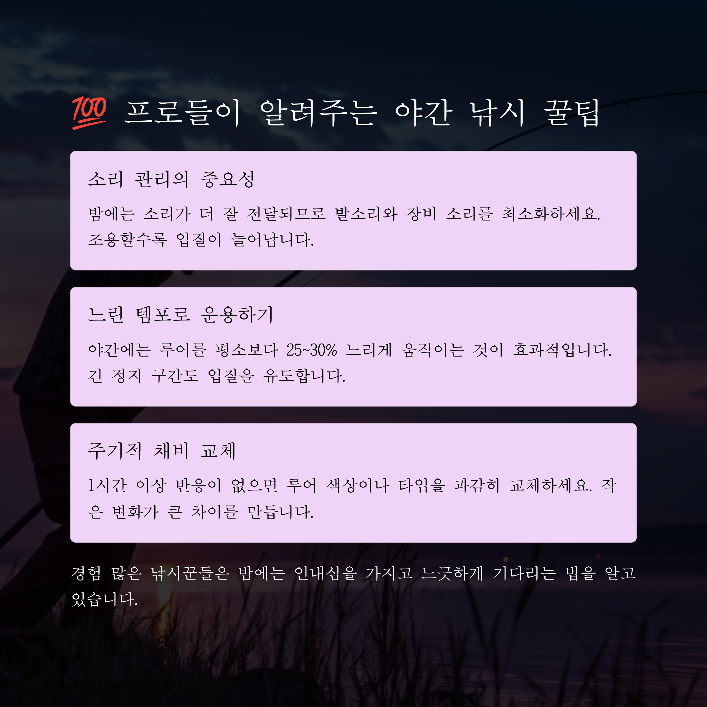 시간 관리가 잘 돼야 체력도 유지되고, 야간 낚시의 만족도도 훨씬 높아져요 ⏱️
