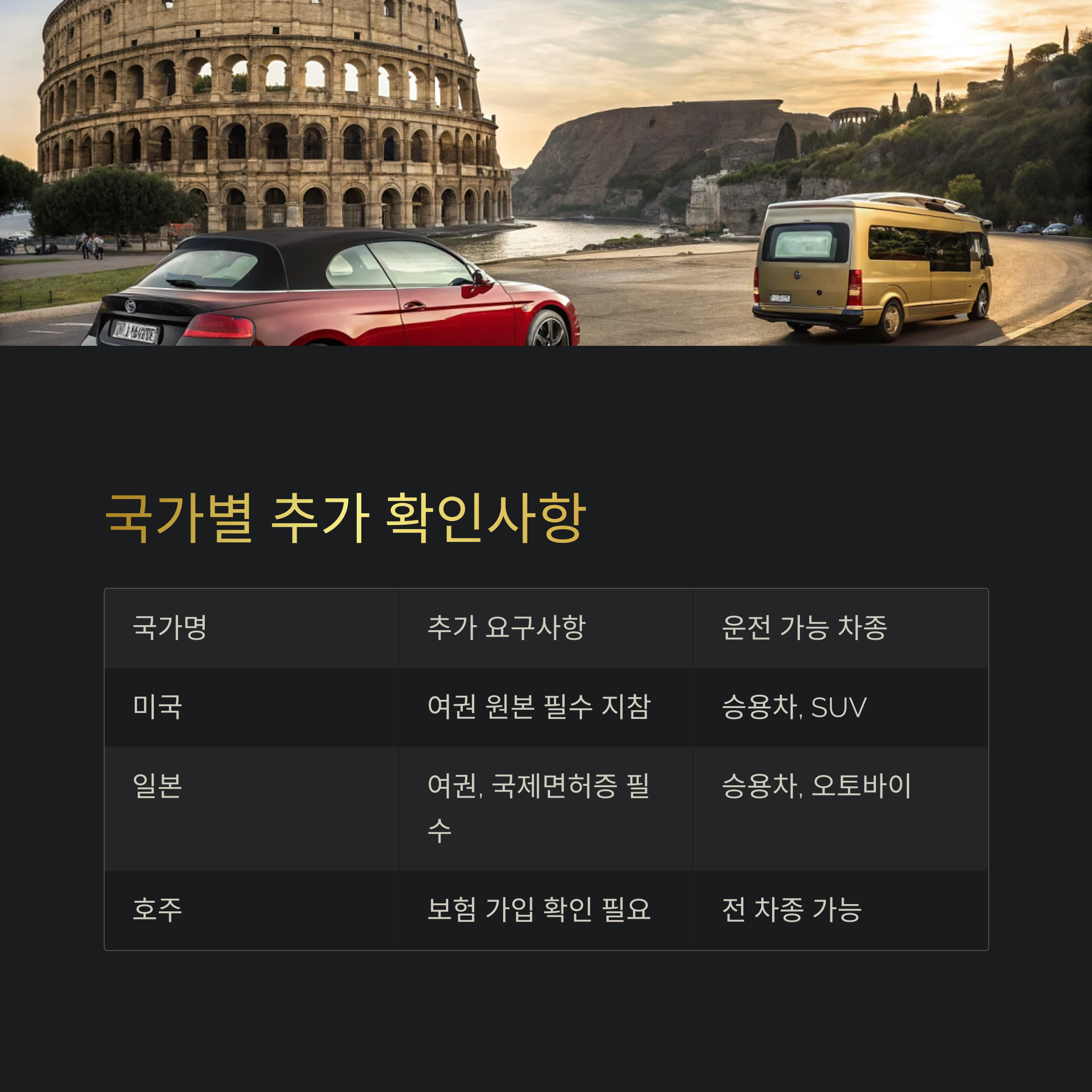 | 호주 | 보험 가입 확인 필요 | 전 차종 가능 |