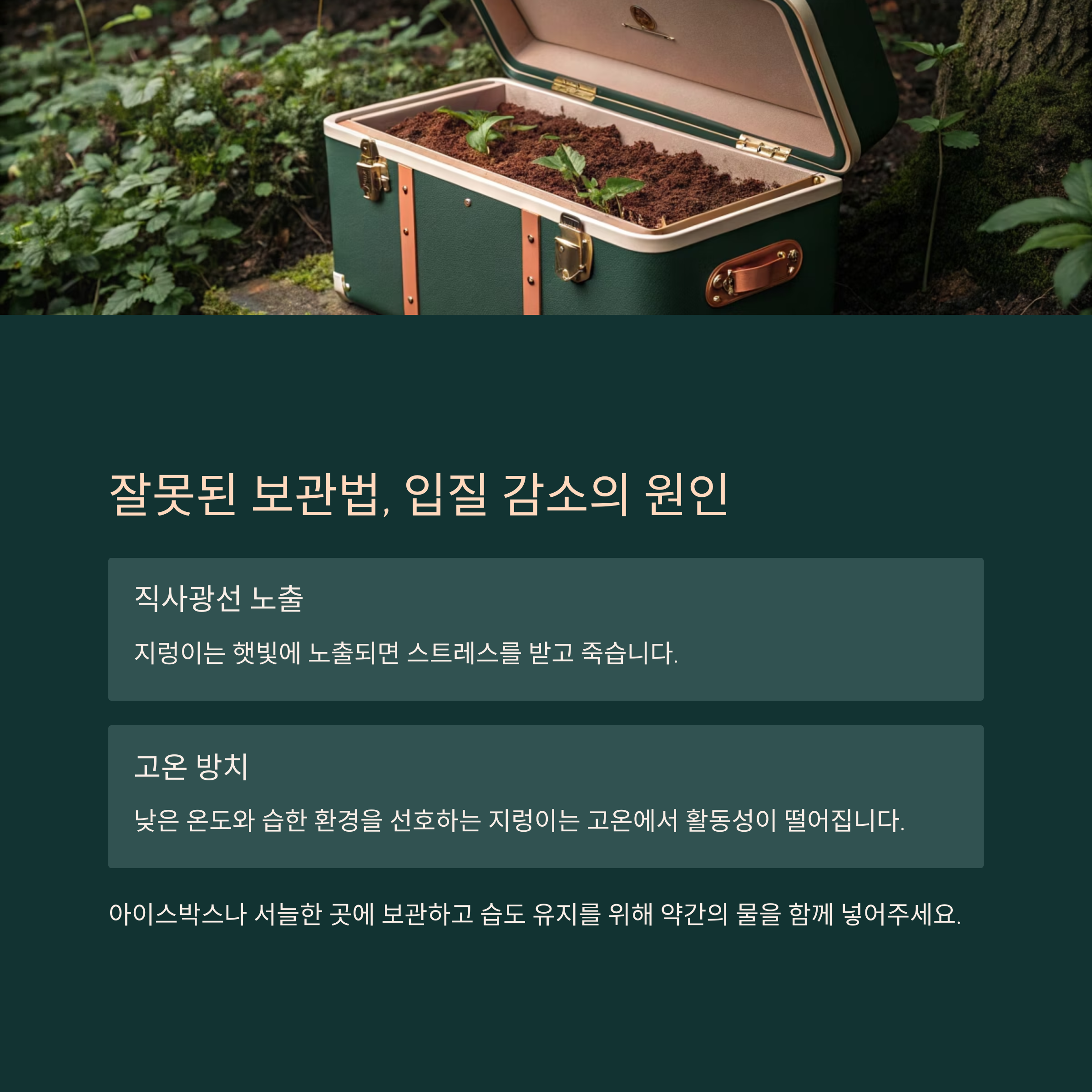 지렁이를 보관할 때 가장 흔한 실수는 직사광선 노출과 고온 방치입니다.