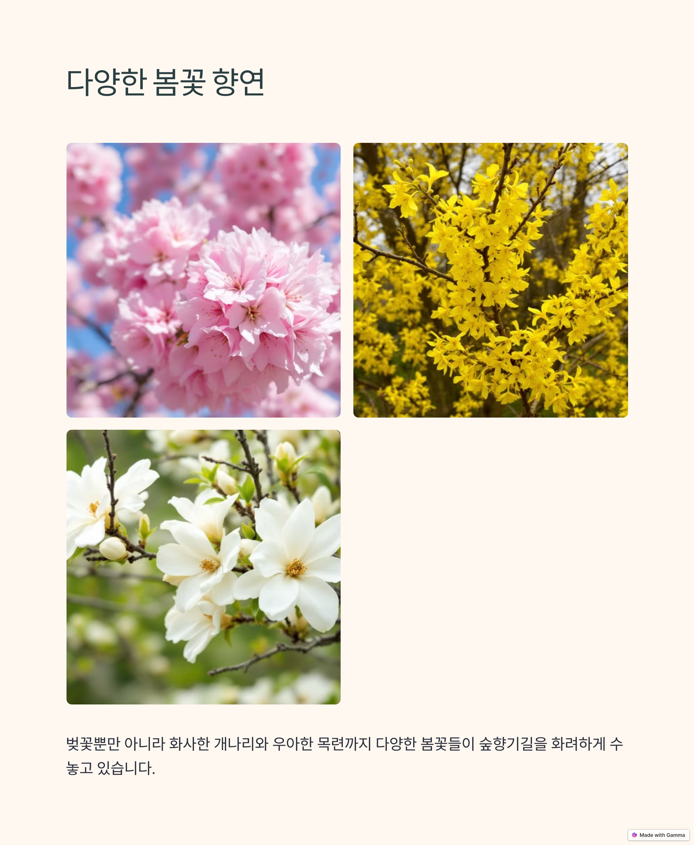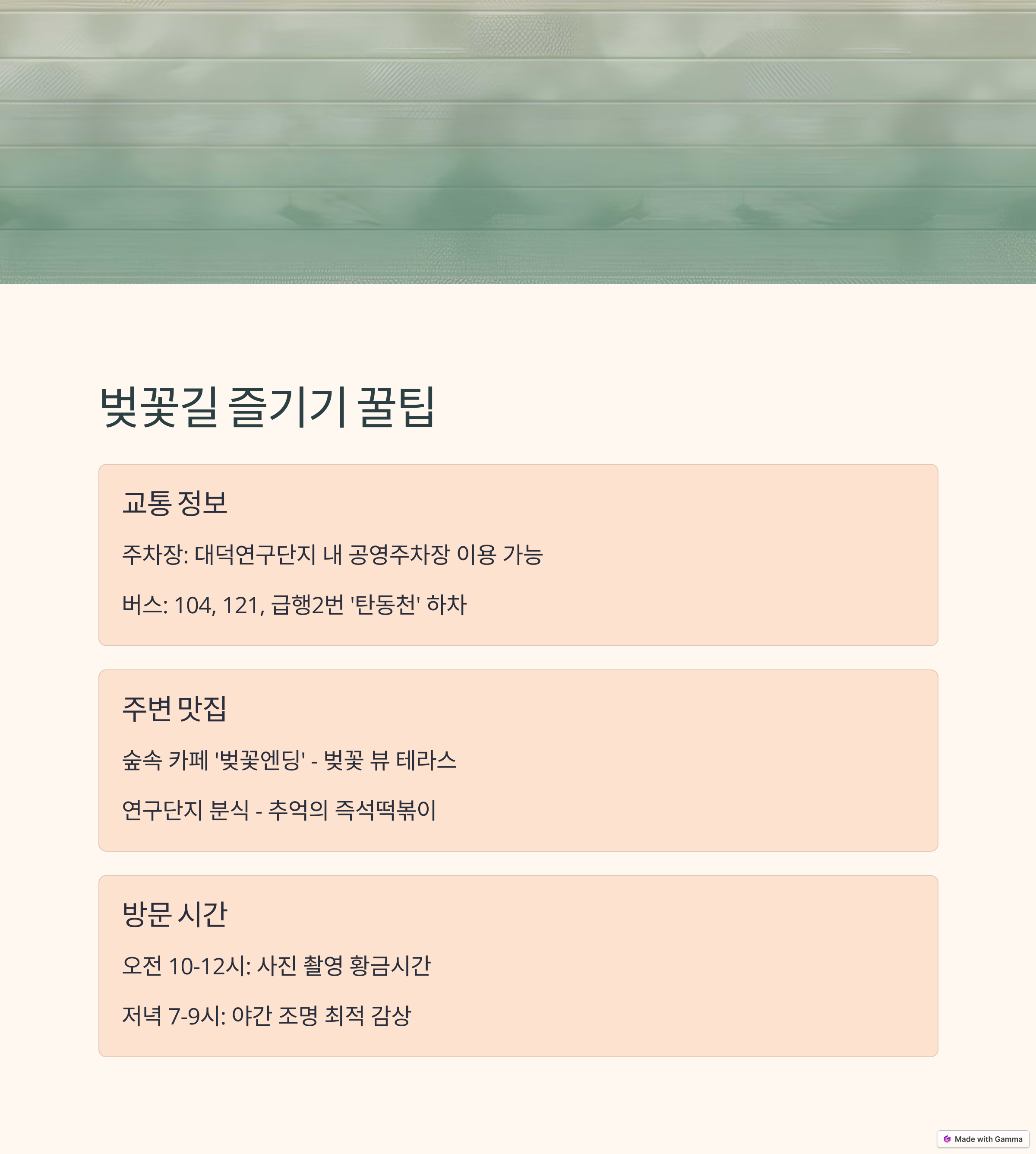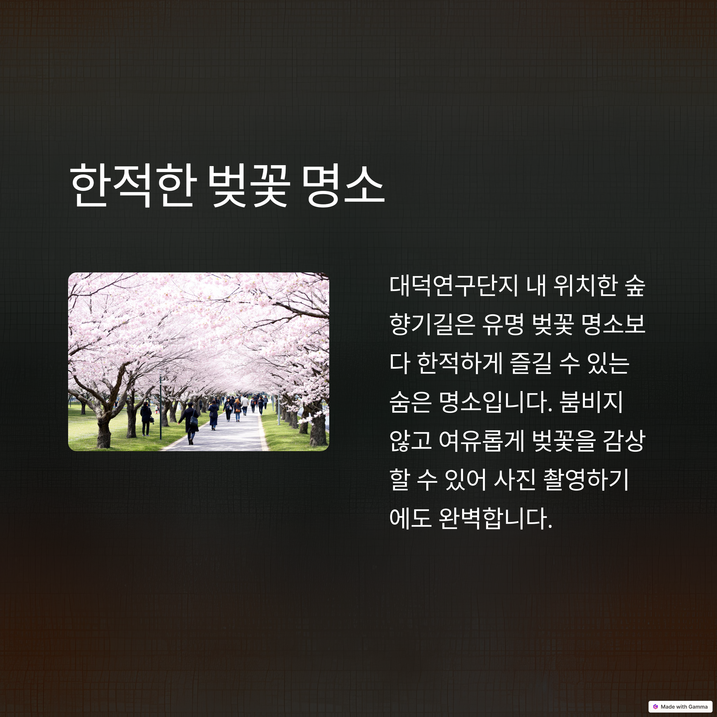 | 대전 대덕연구단지 인근 숲향기길 따라 위치 | 4월 초~중순까지 만개, 현재 절정 | 경관조명과 조용한 분위기로 감성 산책 가능 |