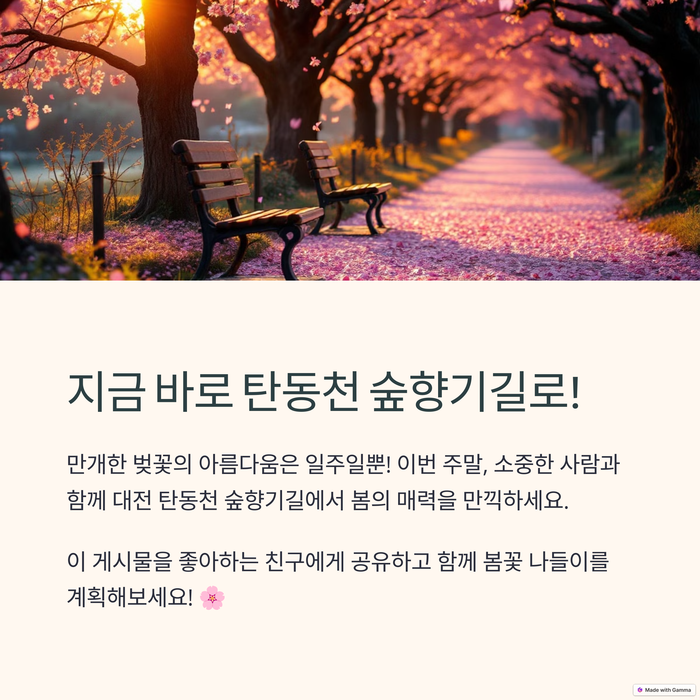 대전 탄동천의 벚꽃은 지금이 가장 아름다운 시기입니다. 평소 붐비는 관광지보다 여유 있는 분위기를 선호하시는 분들께 안성맞춤인 장소이며, 특히 경관조명 덕분에 야간 산책도 특별한 경험으로 남습니다. 벚꽃 외에도 다양한 봄꽃들이 함께 어우러져 시선을 사로잡고, 자연 속에서 휴식을 원하는 분들께 강력히 추천드립니다. 이번 주말, 사랑하는 사람과 함께 탄동천의 벚꽃길을 거닐며 봄을 온전히 느껴보는 건 어떠신가요?