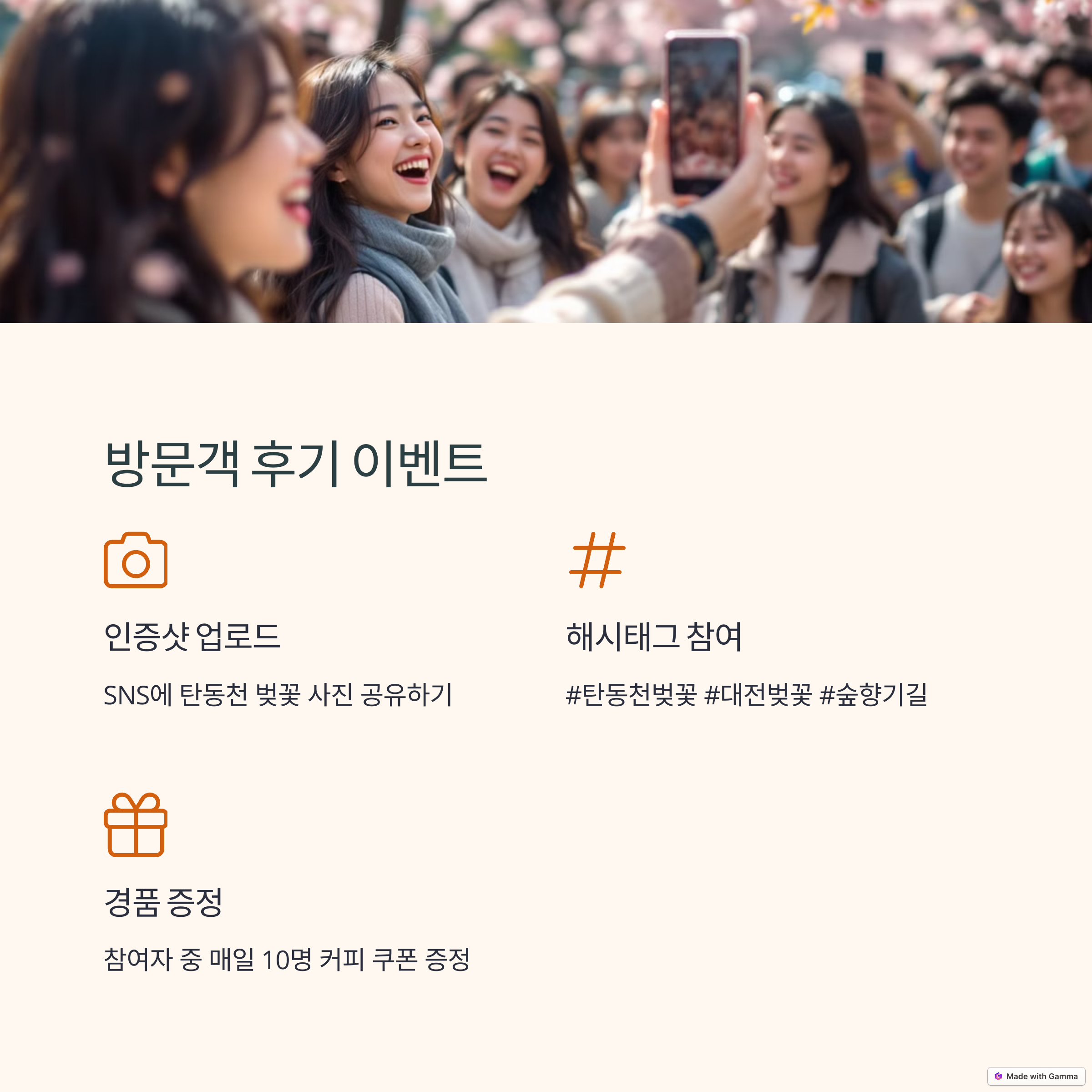 탄동천 벚꽃길을 다녀오신 경험이 있으신가요? 혹은 이 글을 참고하여 방문하셨다면 어떤 느낌이셨나요? 댓글로 소중한 경험과 의견을 남겨주시면 다른 분들께도 큰 도움이 될 거예요!