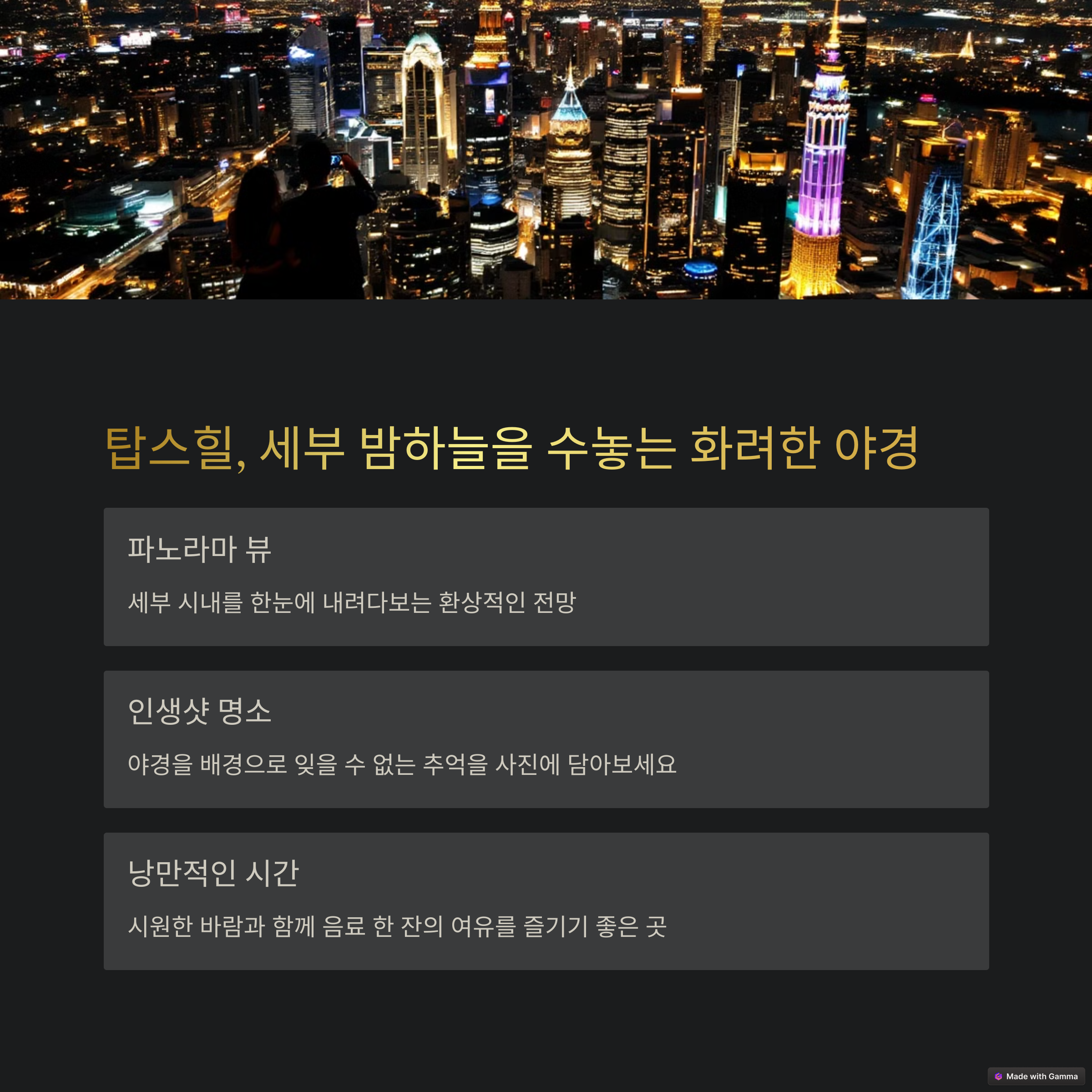 | 시티투어 추천 코스 | 산토니뇨 성당, 마젤란 십자가, SM몰 등 |